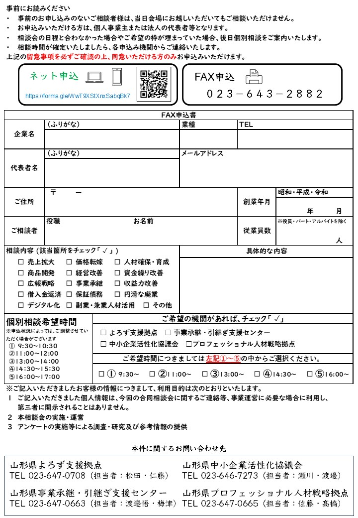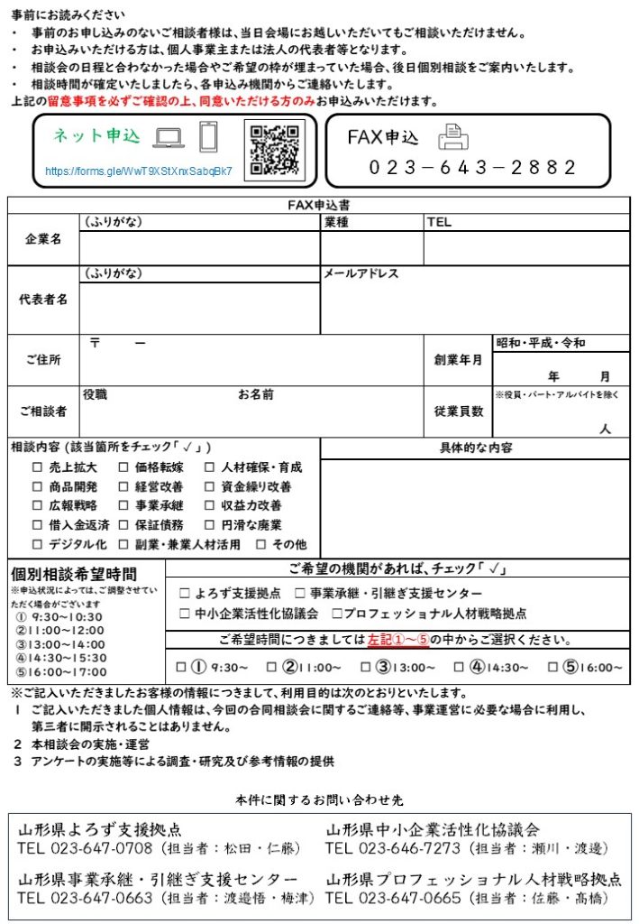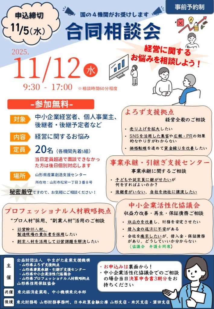 山形県よろず支援拠点・山形県事業承継・引継ぎ支援センター・山形県中小企業活性化協議会・山形県プロフェッショナル人材戦略拠点の4機関で合同相談会を開催します!